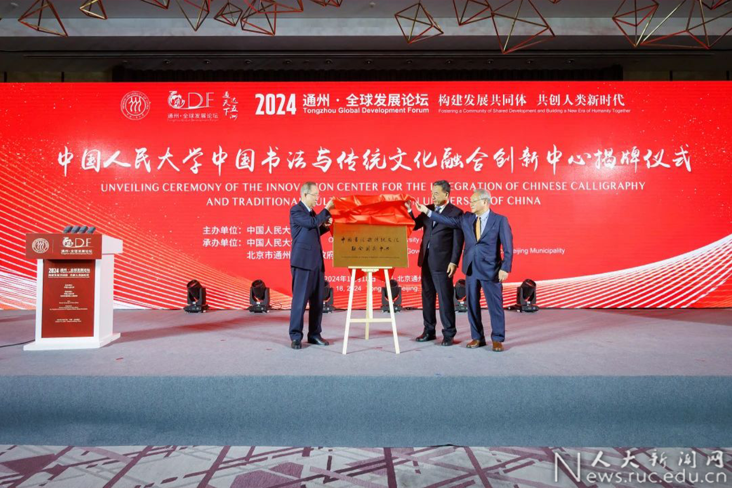 潘基文、张东刚和潘基文基金会北京代表处首席代表金塾共同为中国人民大学中国书法与传统文化融合创新中心揭牌。