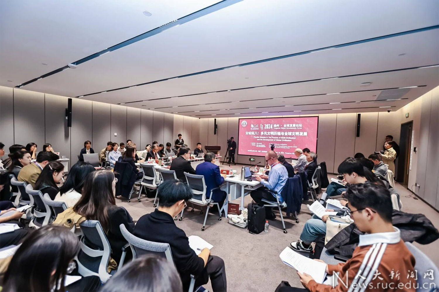 分论坛八着眼“多元文明历程与全球文明发展”,中国人民大学党委副书记青格勒图致辞,日本一桥大学社会学部荣誉教授平子友长,中央编译局原秘书长杨金海,钱乘旦,中国人民大学原副校长杨慧林等聚焦“‘两个结合’与文明和谐发展”“多元视角下的文明史”主题,以哲学和历史的视角针对全球文明发展开展深入研讨交流,并探讨了文明学研究的相关议题。