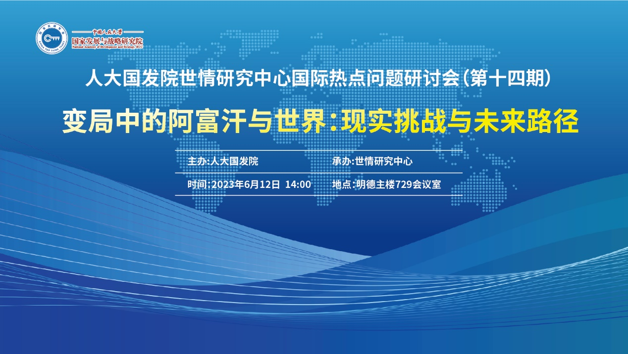 2023年6月12日,由中国人民大学国家发展与战略研究院主办,世情研究中心承办的国际热点问题研讨会(第十四期)——“变局中的阿富汗与世界:现实挑战与未来路径”成功举行。