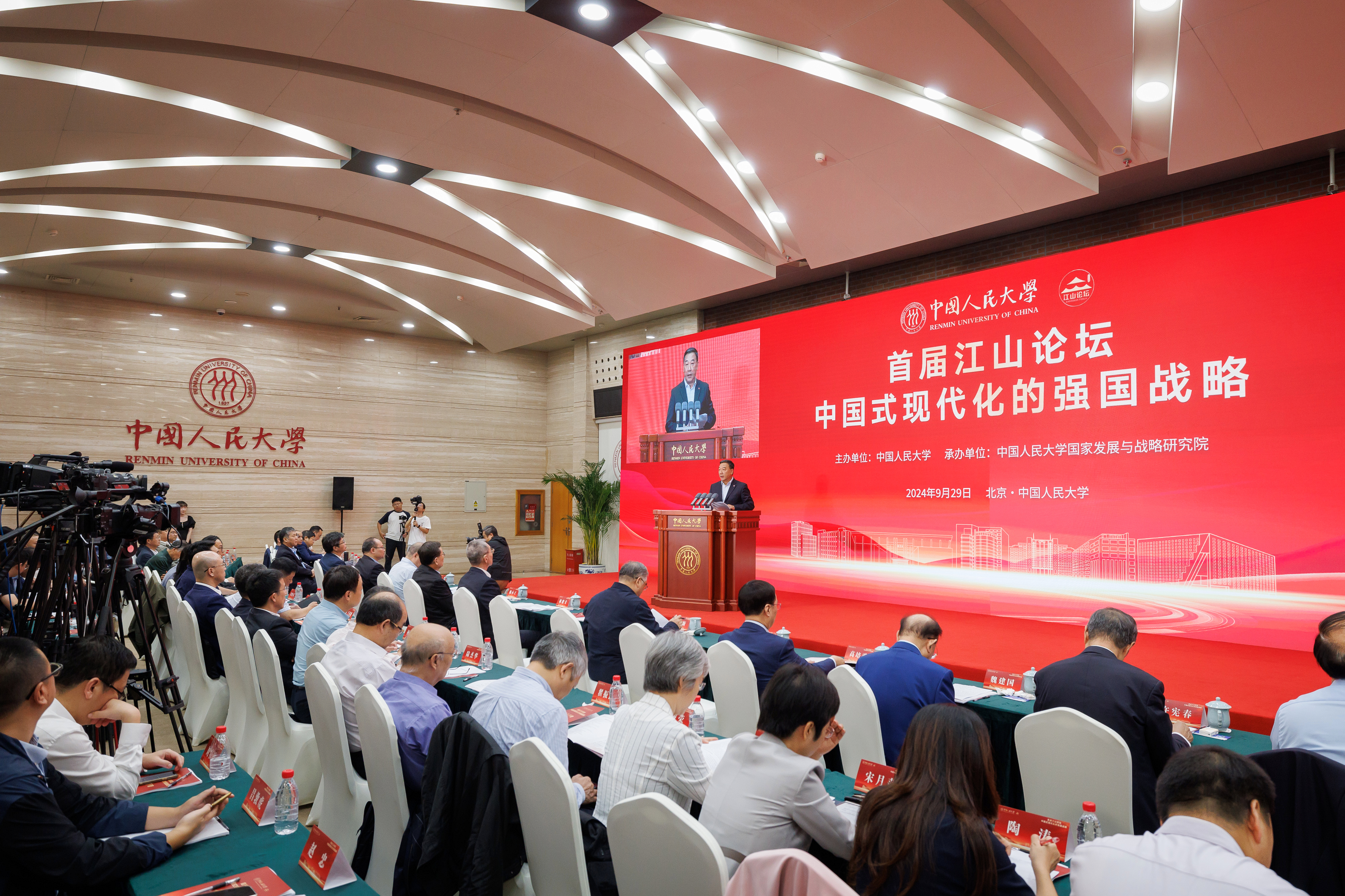 发布时间:2024-09-302024年9月29日下午,首届江山论坛在中国人民大学成功举办。本届论坛以“中国式现代化的强国战略”为主题,旨在以习近平总书记关于强国建设、民族复兴等重要论述为根本遵循,坚持“江山就是人民、人民就是江山”,搭建多方参与、互动交流、深度研究、咨政建言的高端综合性平台,围绕“中国式现代化”展开持续深入、全面多维的研究和交流,全面阐释、广泛宣传中国式现代化的理论与实践。论坛由中国人民大学主办,由中国人民大学国家发展与战略研究院具体承办,由中国人民大学人口与健康学院、劳动人事学院、哲学院、生态环境学院和国际关系学院分别承办五个平行分论坛。本届论坛邀请了60多位来自全国多所高校、科研机构的领导和知名专家学者,从多维度阐释论坛主题所蕴含的丰富实践意义、理论意义和学术价值,诠释论坛的初心和使命。