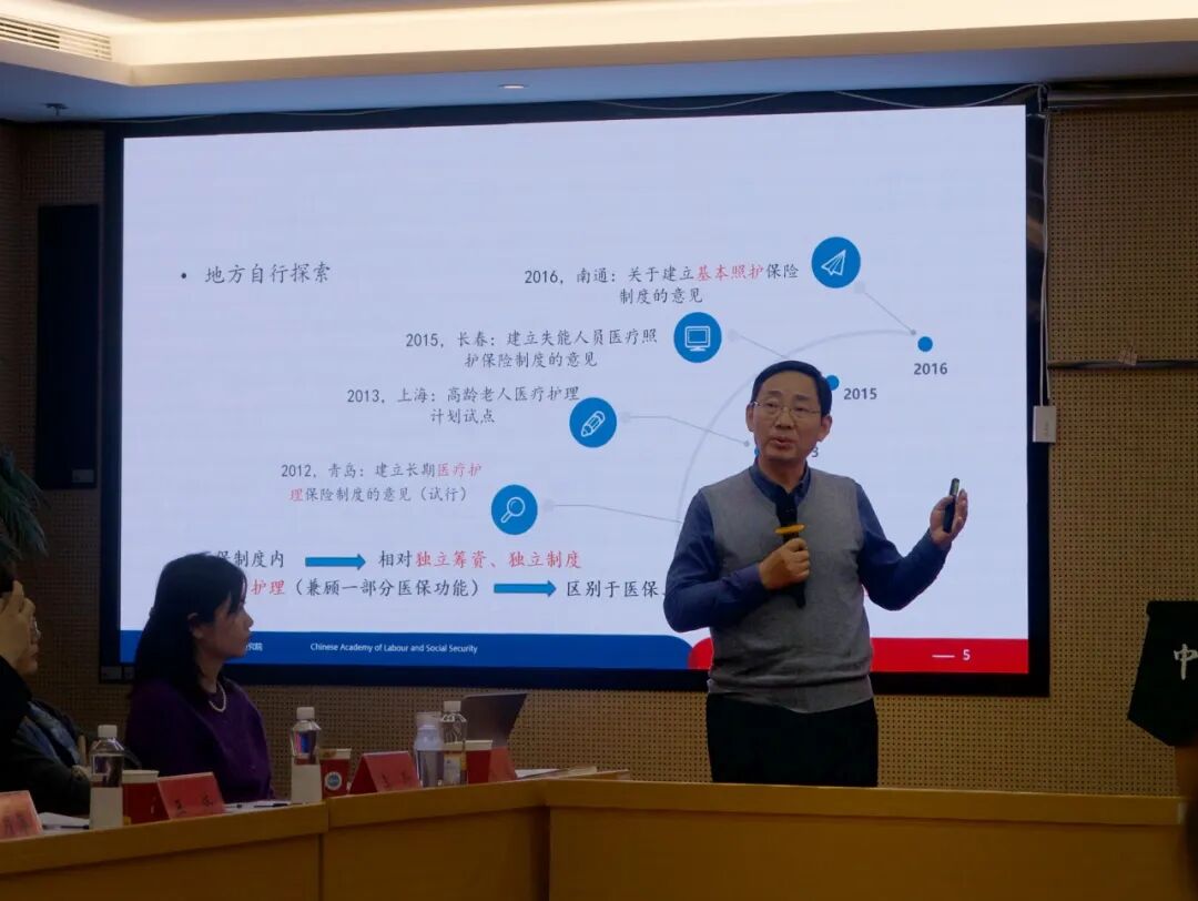 王宗凡主任作题为《长期护理保险制度:从试点探索到全面建制》的报告。他从制度演进视角梳理了我国长期护理保险制度由地方探索、国家试点到全面建制的发展过程。他表示,人口老龄化加深、高龄失能风险上升、家庭照护功能弱化以及医保体系中长期住院等问题,共同构成了长护险制度发展的现实背景。地方试点逐步明确了长护险区别于医疗保险的独特定位,即围绕失能人群基本生活照料及相关护理需求提供制度化保障。在此基础上,国家层面形成了试点扩围、政策规范和全面推进的制度路径,并围绕筹资、待遇、经办管理及与照护服务协同发展等问题,分析了未来政策框架与实践方向。
