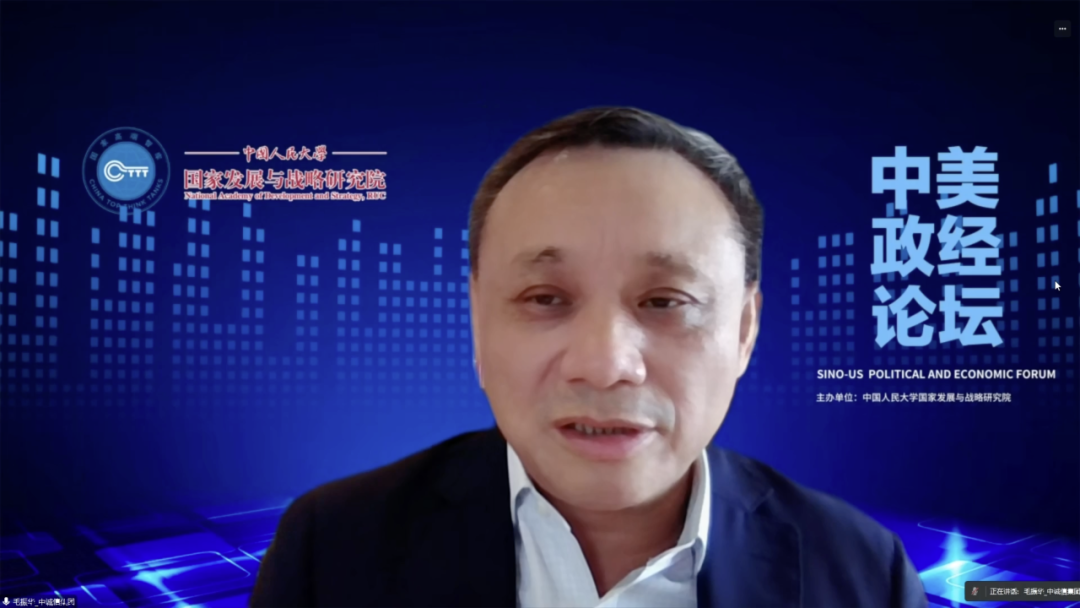 中国人民大学经济研究所联席所长、教授,中诚信集团董事长毛振华首先强调在判断当前各种经济状况时要拉长视野看中美两国政策和经济的同步和分化,尤其是中美两国的经济处在不同的阶段。受疫情、中美博弈等因素的影响,中国目前还处在一个经济调整期。另一方面,毛教授表示中美两国汇率的波动导致中美GDP比例产生变化,对此我们要有一个正常的心态。毛教授认为,萨默斯表示中国在2050年前不太可能超过美国的判断对于我国来说有积极的影响。即便中美之间各种竞争加剧,但中国仍然要保持定力做好自己的事情。我们要化危为机,把汇率贬值变成对我们有利的一个机遇,坚持市场化和改革开放来保持积极性,才能在未来国际竞争中更加自信,能够更好地维护国家利益。
