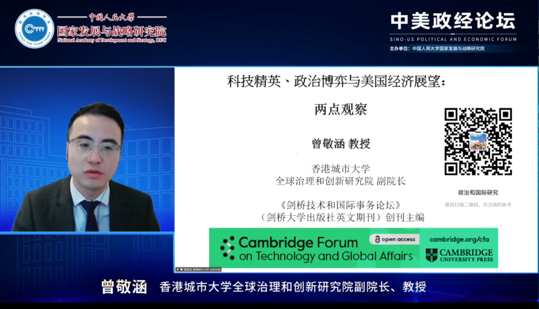 第一单元由中国人民大学二级教授、吴玉章特聘教授保建云发布报告《科技精英、政治博弈与美国经济展望》。