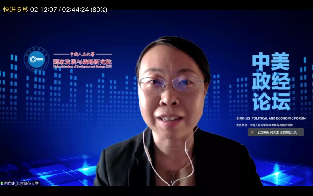 发布时间:2021-12-2312月21日,由中国人民大学国家发展与战略研究院主办的中美政经论坛(第5期)于线上举行。中国与美国作为世界大国,其政经交往对两国及世界均具有重要影响,对于加强中美关系的研究具有重要意义。为此,人大国发院设立中美政经论坛,初衷在于搭建跨学科的学术与智库平台,组织相关专家定期发布关于中美研究的最新学术成果,邀请学界同仁进行讨论碰撞,助力学界对美国及中美政经关系的学术研究与讨论。百度、凤凰网直播、新浪微博、中国网等多家媒体平台联合线上直播。