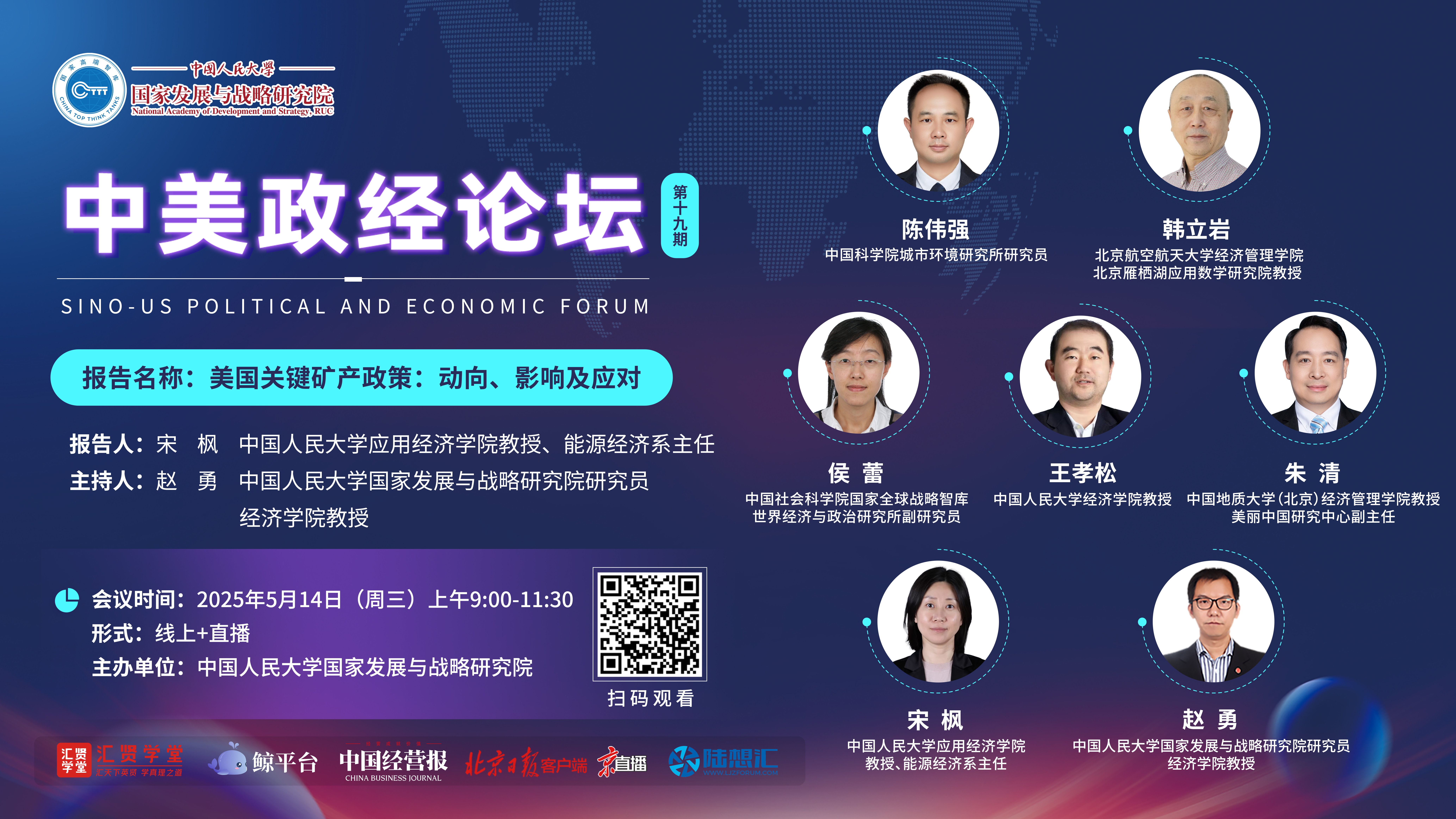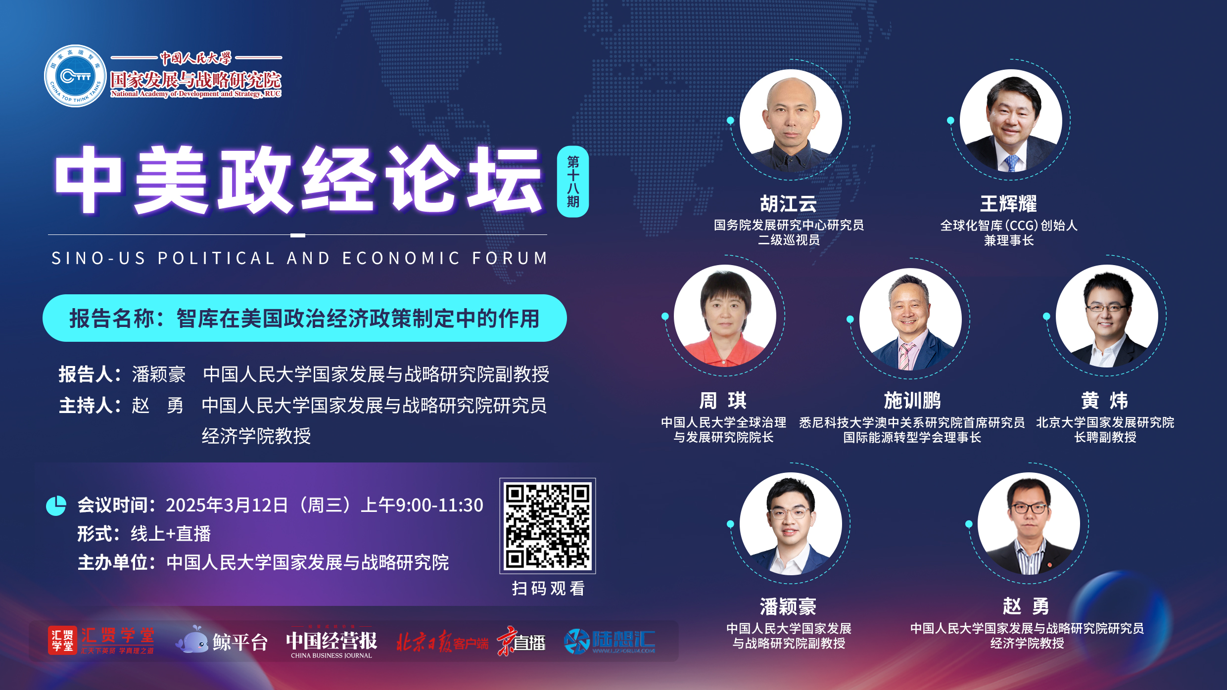 发布时间:2025-01-172025年1月15日,由中国人民大学国家发展与战略研究院主办的中美政经论坛(第17期)于线上举行。中国与美国作为世界大国,其政经交往对两国及世界均具有重要影响,对于加强中美关系的研究具有重要意义。基于此,人大国发院设立了中美政经论坛,旨在搭建跨学科的学术与智库平台,定期组织团队深入挖掘各领域的关键问题和核心问题并发布中美研究的最新学术成果。邀请学界同仁进行讨论碰撞,助力学界对美国及中美关系的学术研究与讨论。