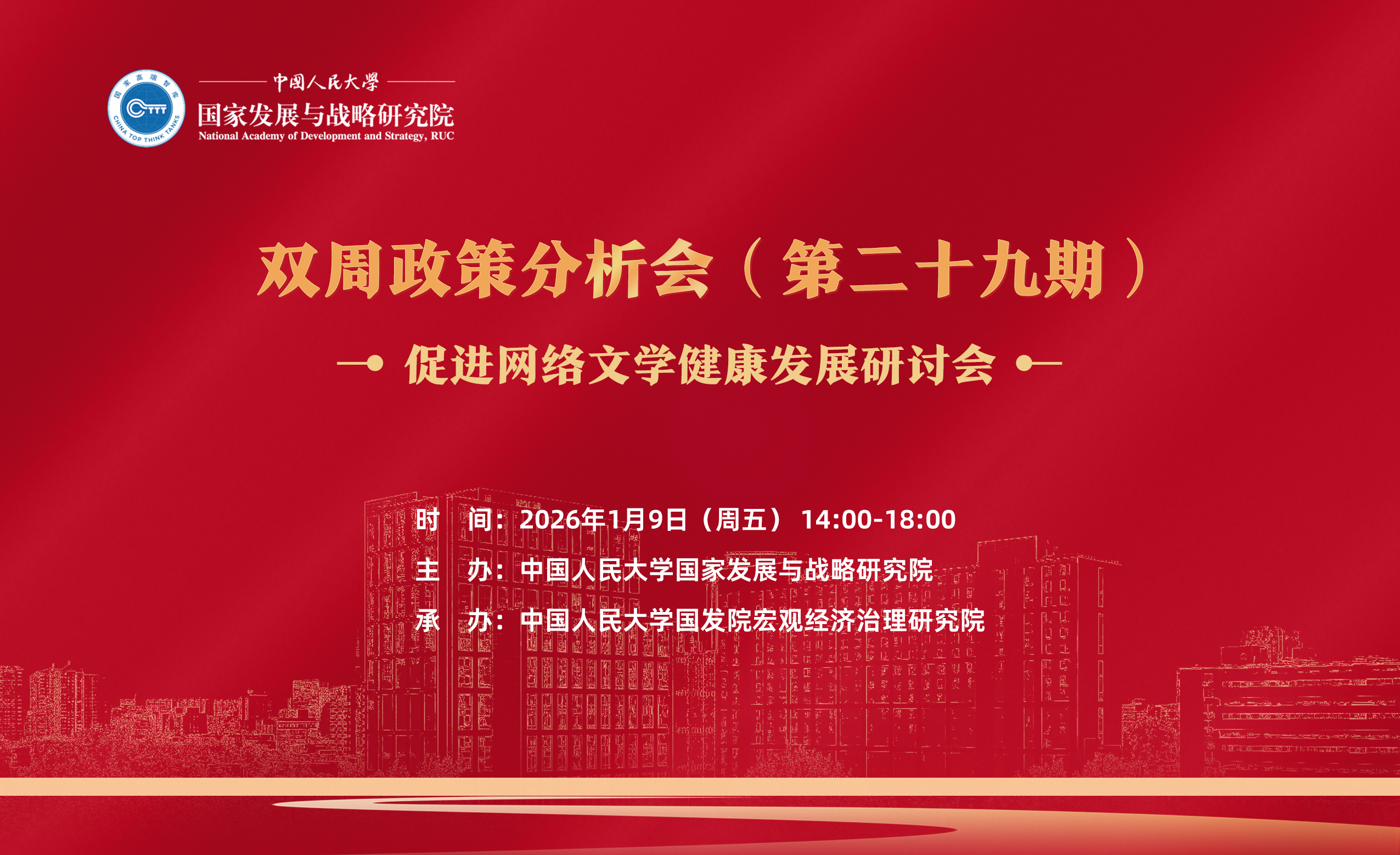 “双周政策分析会”是中国人民大学国家发展与战略研究院打造的一个高端政策研讨交流平台,旨在通过对公共政策的研究分析和综合评估以推进人大国发院的“新平台、大网络,跨学科、重交叉,促创新、高产出”高端智库建设。该平台通过汇聚校内外、政产学优质资源,力图为政治、经济、社会、文化、生态、法律、外交等领域的重大政策议题提供“人大观点”。