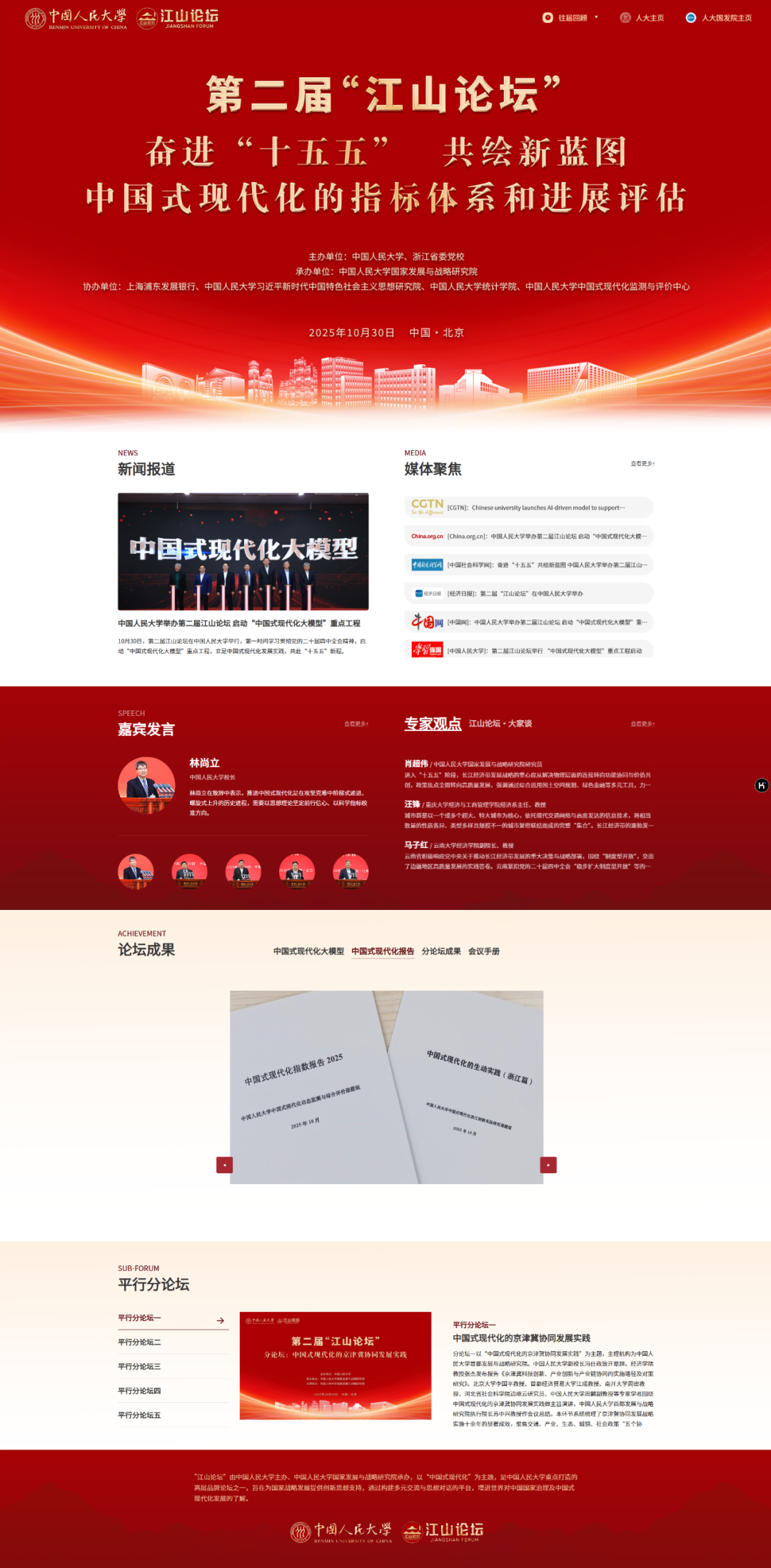 发布时间:2025-11-202025年11月19日,江山论坛专题页面正式上线。作为中国人民大学重点打造的高层品牌论坛的线上展示平台,江山论坛专题页面将全面整合论坛重要成果,系统呈现中国式现代化的学术探索之路。专题页面设有“新闻报道”、“媒体聚焦”、“专家观点”、“论坛成果”、“江山论坛·大家谈”、“平行分论坛”及“历届回顾”等多个板块,包含文字、图片及视频内容,致力于打造江山论坛365天全天候宣传运转机制,构筑与时俱进的思想传播矩阵。
